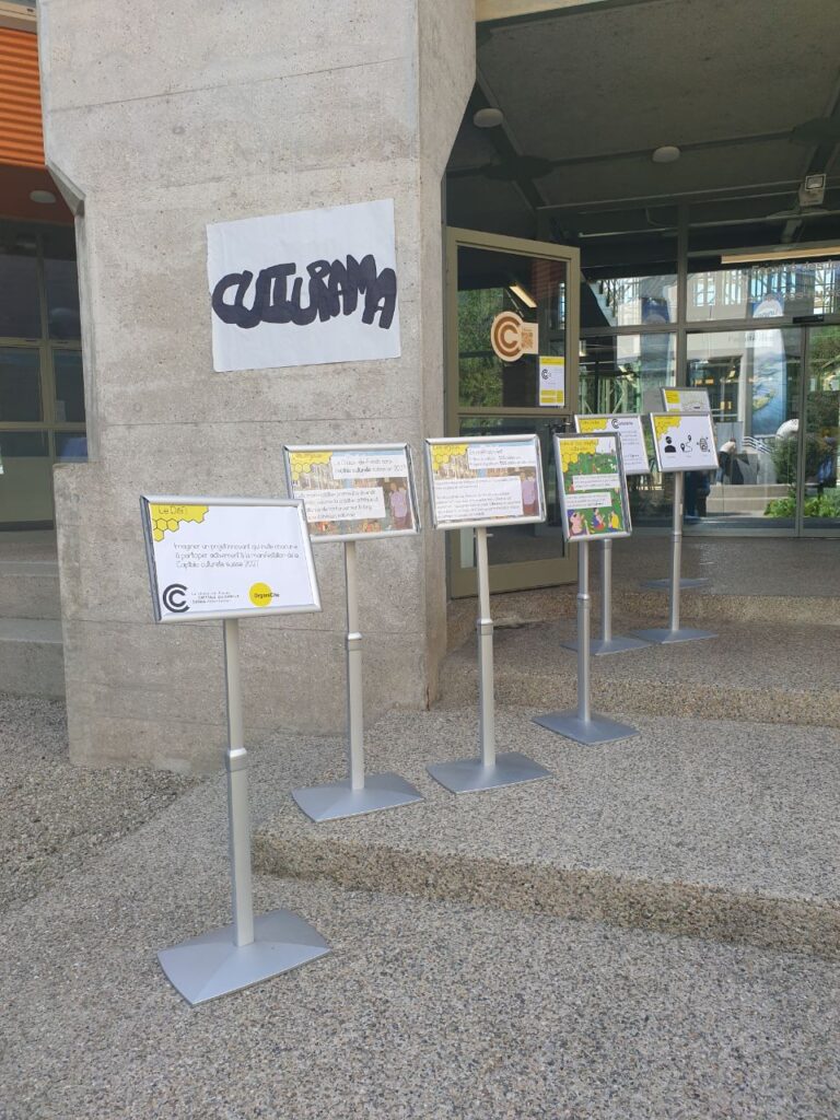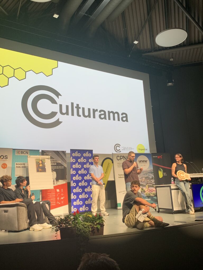 Accompagnée de leur coach Ola Söderström, professeur de géographie à l’Université de Neuchâtel, l’équipe a proposé le projet Culturama. Le concept : créer un réseau vivant et convivial autour des passions, savoir-faire et activités culturelles des Chaux-de-Fonniers et Chaux-de-Fonnières. Grâce à un système de balise, les habitantes et habitants, les associations et les collectifs de la ville se signalent comme lieu de partage et proposent une activité ou une rencontre autour de leur passion. A intervalle régulier, l’ensemble de ces adeptes de culture se retrouvent pour un événement festif à La Ruche. Cet espace aménagé aux Anciens abattoirs constitue un lieu d’échange privilégié, propice à resserrer les liens entre membres et à développer le réseau.
